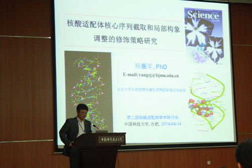第八届全国核糖核酸 (RNA)学术讨论会与第二届中国核酸适配体学术研讨会暨筛选技术培训班于2014年4月12-18日先后在安徽省合肥市召开。我系杨振军教授与多位研究生参会,以口头报告与墙报的形式展示了杨振军教授课题组在siRNA及核酸适配体生物活性研究方面的进展,并与参会的相关领域专业人员进行了深入交流。